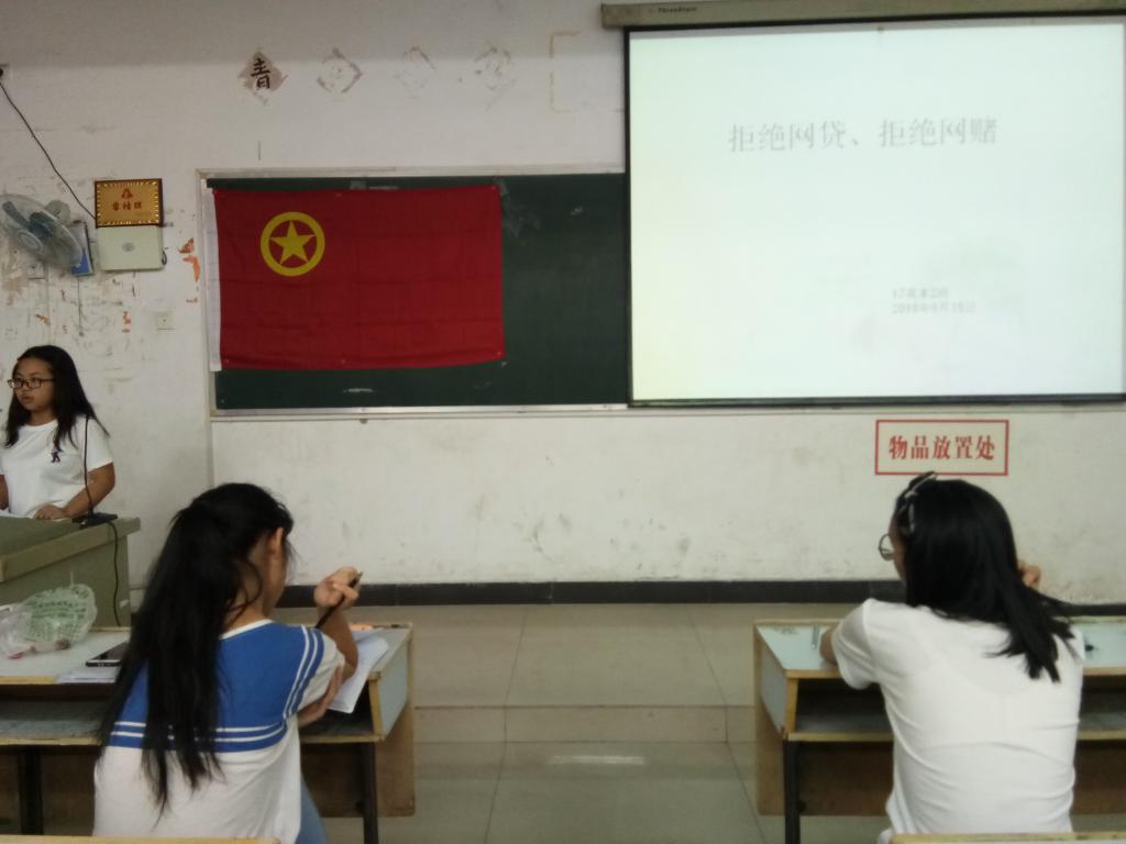 为增强大学生的健康正确的消费意识,2018年6月15日早上7:50,外国语学院17英本2班在英华楼3337召开“拒绝网贷,拒绝网赌”班会。主持这次班会的是班长,参加这次班会的是17英本2班全体成员。