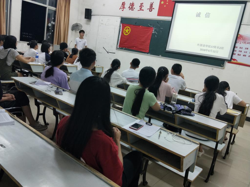 2018年6月12日,外国语学院17商本2班在英华楼3508开展了诚信在身边的主题班会。班会的开始主持人讲述了我国历史上些诚实守信的故事,使同学们更好的理解诚信的重要性;接下来,主持人让同学们上台讲述自己在生活中看见的或者发生在自己身边关于诚信方面的事情;班会的最后,主持人询问了同学们平时在生活中是一个怎样的人,能不能做到诚实守信,以及该如何去做一个诚实守信的人。