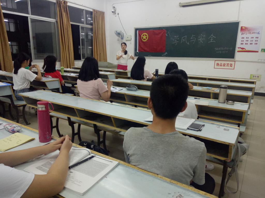 为了激发同学们的学习热情,端正同学们的学习态度,树立良好的学风以及提醒同学们注意网络安全,谨防网络受骗,外国语学院16商本1班在2018年6月13日召开以"抵制校园贷、远离网络赌博、树立良好学风"为主题的主题班会,此次班会由班主任廖宇沙老师召开,全班同学参与。