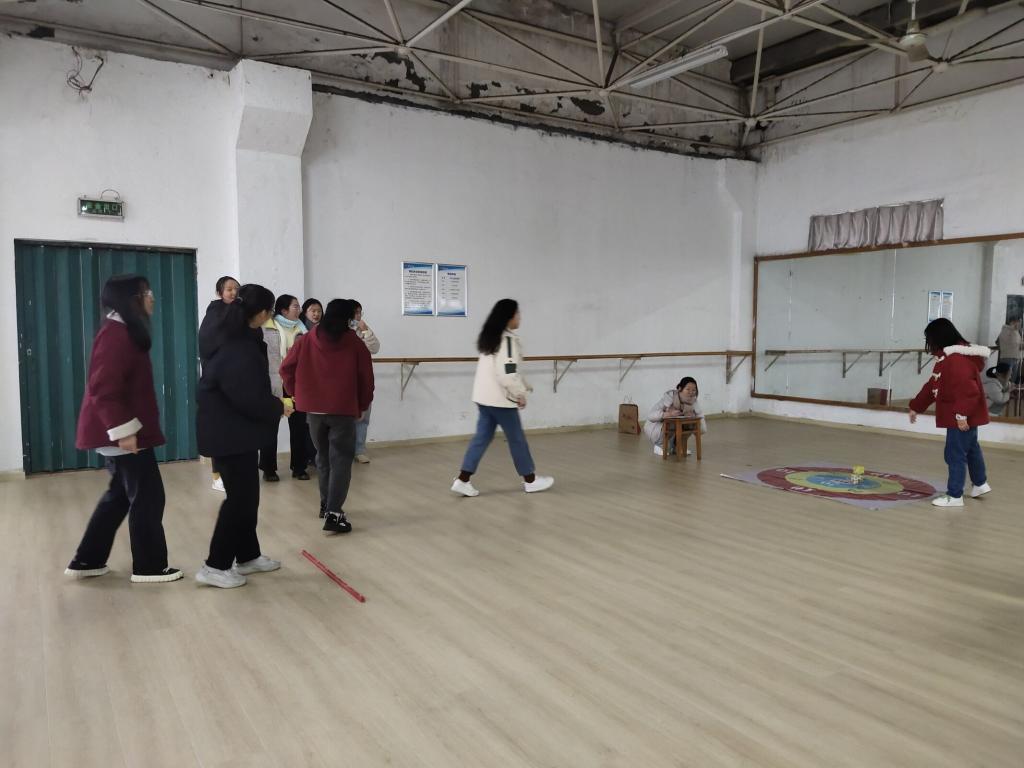 比赛开始前半小时,各班选手提前到场体验各个游戏环节,随后由王老师介绍比赛规则,并抽签决定每个班级的先后比赛顺序。此次活动分为四个游戏环节,分别是“公鸡下蛋”、“不倒森林”、“摸石过河”“沙包投掷”。比赛安排得非常紧凑,四个游戏环节同时开展,各班按照抽签顺序依次来到指定区域进行比赛。