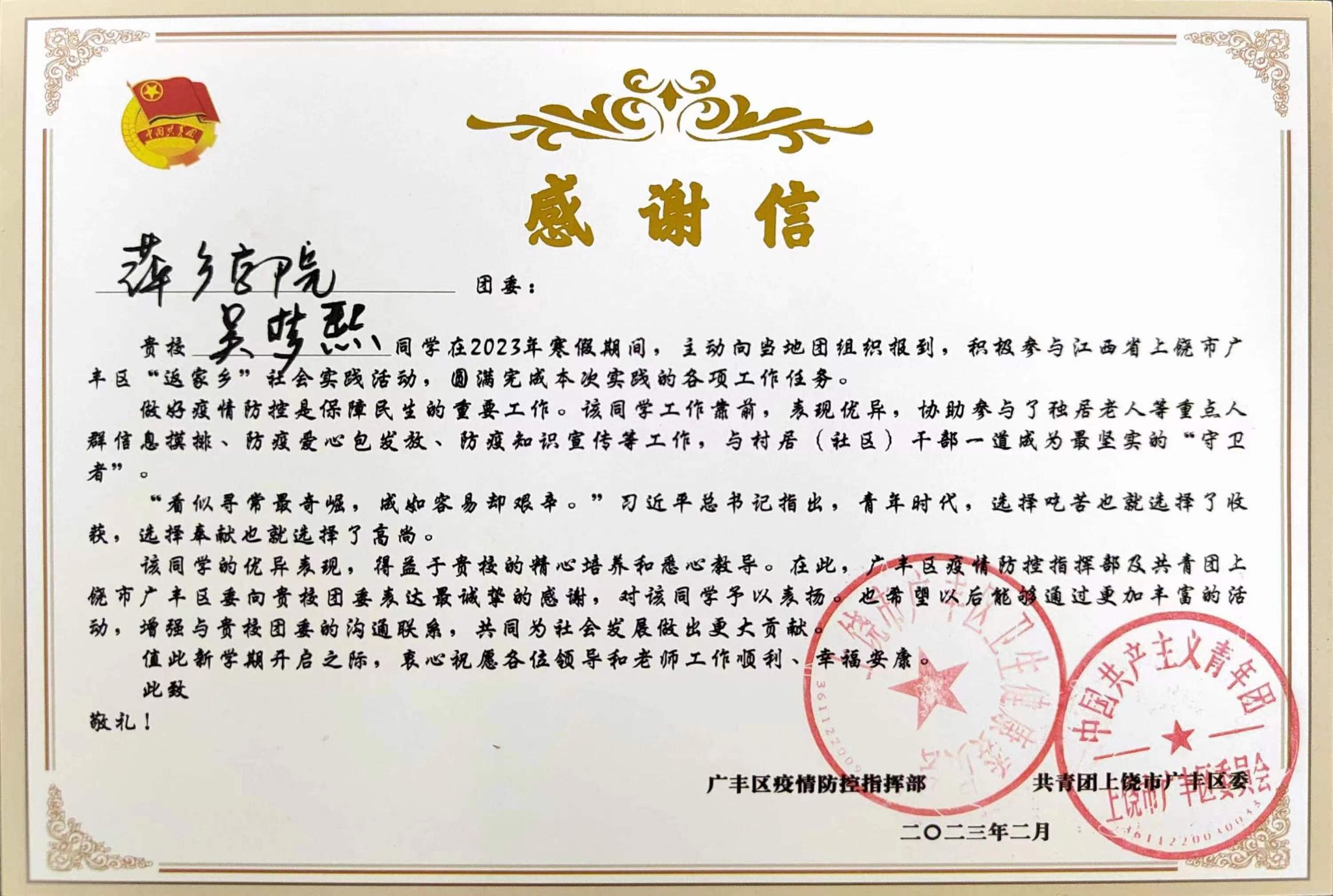 上饶市广丰区疫情防控指挥部及共青团上饶市广丰区委发来表扬信,表扬我院商务英语2202班吴梦熙同学在寒假期间,积极参加上饶市广丰区“返家乡”社会实践活动,并圆满完成各项工作任务,鼓励广大青年积极参加社会志愿服务活动,争取做出更大贡献。