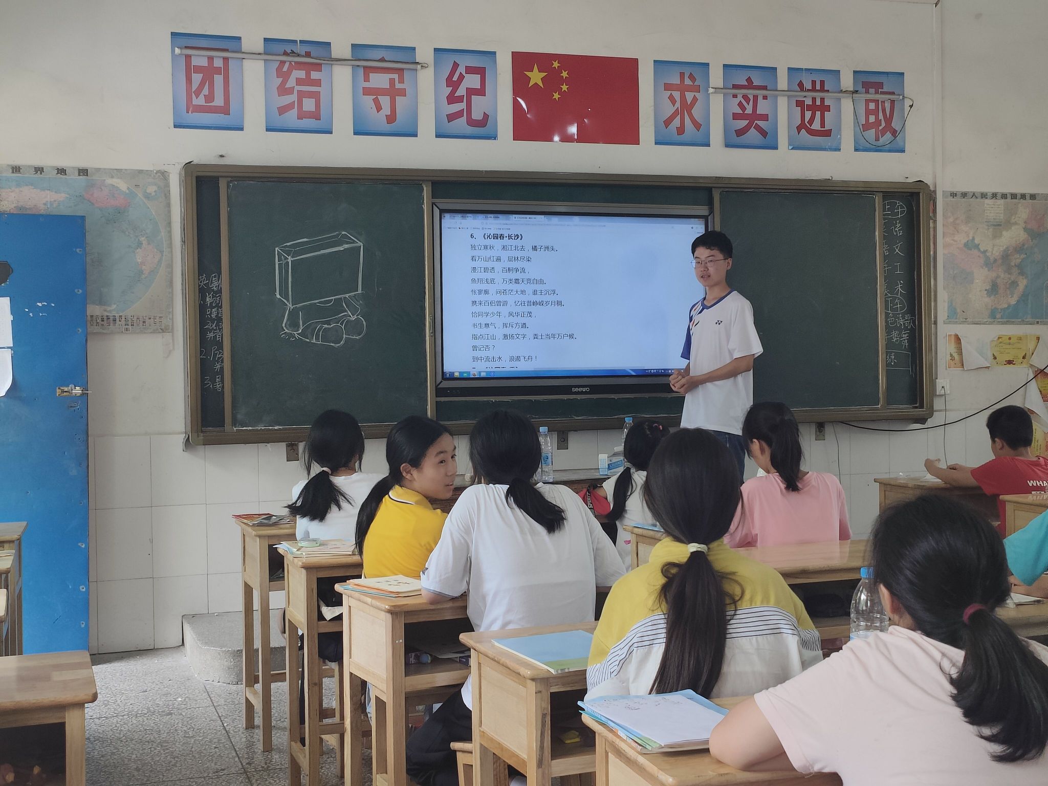 首先,我们来到红色诗歌的课堂。课初,老师带领同学们朗诵《沁园春·长沙》,并详细解释了一些重点词句,帮助同学们更好地理解。同学们一边认真听着老师生动地讲解,一边将诗歌誊抄在笔记本上,在抄写朗诵的过程中,同学们进一步加深了他们对诗歌的理解。接下来我们将目光聚焦在手势舞的课堂上。老师不仅为同学们播放了《少年中国说》的手势舞视频,还亲身示范,带领着同学们一起学习手势舞的每个动作细节,课堂氛围十分活跃。同学们在老师的带领下,把原本僵硬不协调的动作变得越来越娴熟。正式的上课内容结束后,老师们进行文艺汇演的安排及排练。秉持自愿的原则,让大家自主选择自己感兴趣的活动项目,开始了简短的排练。尽管同学们刚开始不是很配合,但是在老师的积极鼓励下,同学们还是获得了巨大的进步。