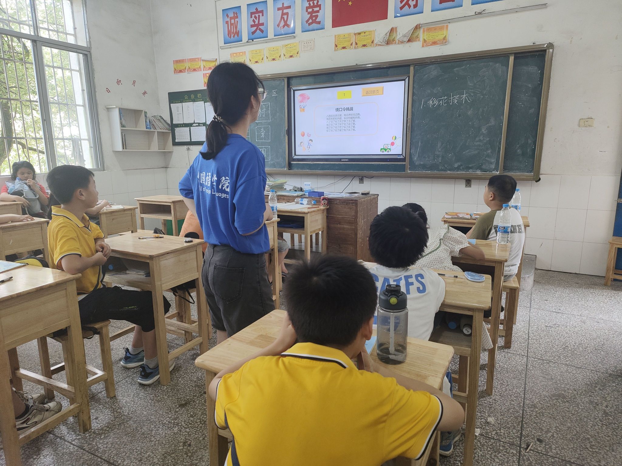 吃过午饭后,支教团的成员们按时来到校门口值班,迎接下午上课的同学们。烈日依旧,志愿者们的汗水已经浸透衣服,疲倦与困意已缓缓袭来,但他们对待值班工作的认真态度却没有一丝改变。于14:30,负责第一节课的老师准时清点完人数,全体同学到齐后,下午的课程便正式开始。