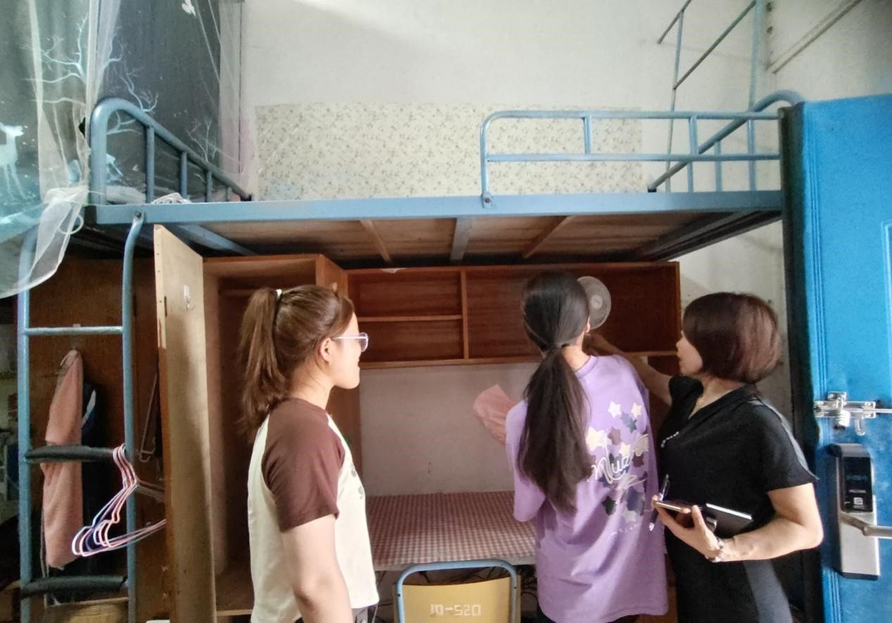 在此次下寝活动中,老师们逐一检查寝室门窗桌椅是否损坏、是否存在电线裸露、天花板破裂以及床板螺丝松动等情况。