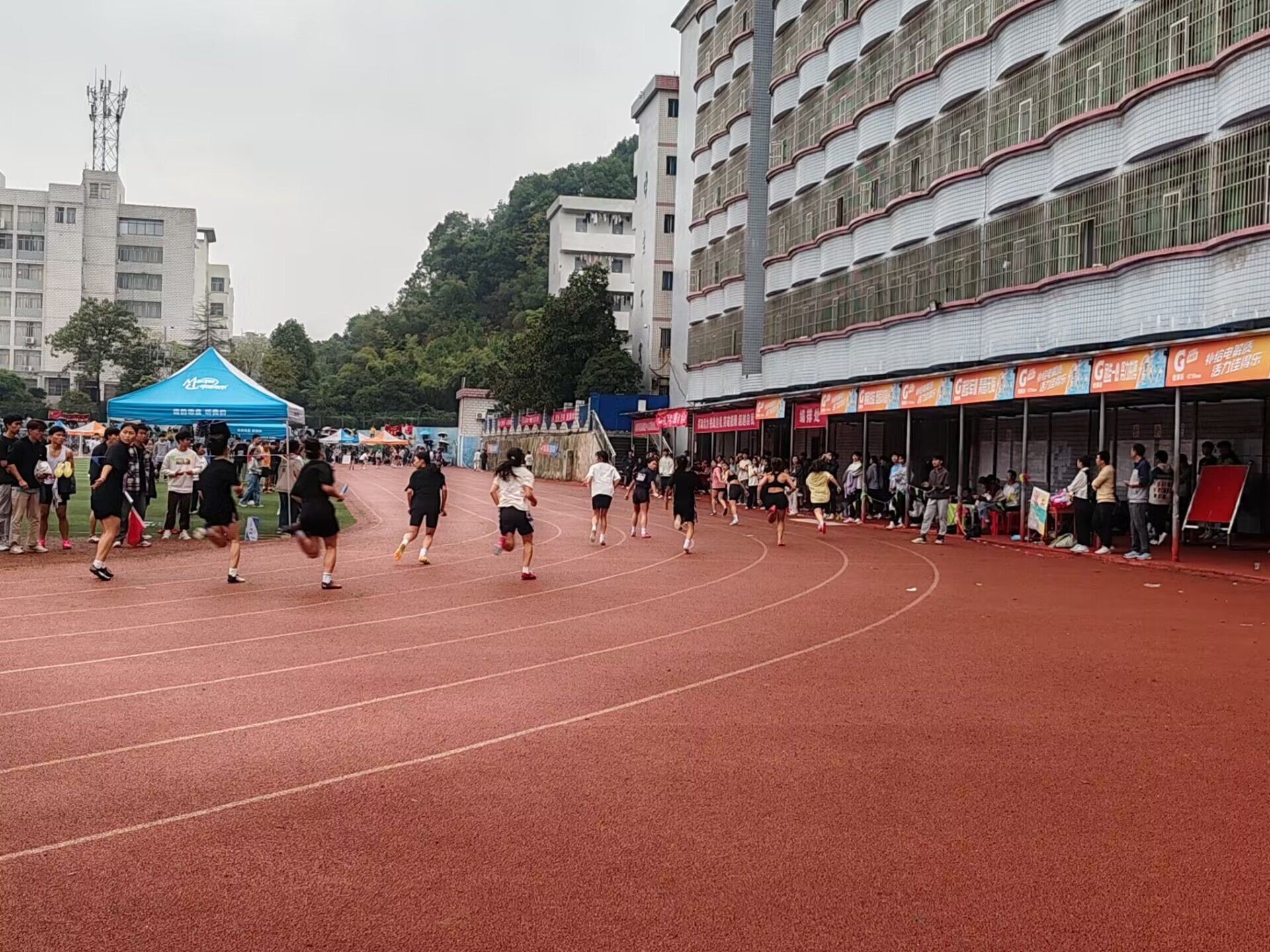 运动会的号角吹散了灰蒙蒙的乌云,伴随着淅淅沥沥的雨声,校园运动会第二天开始了。