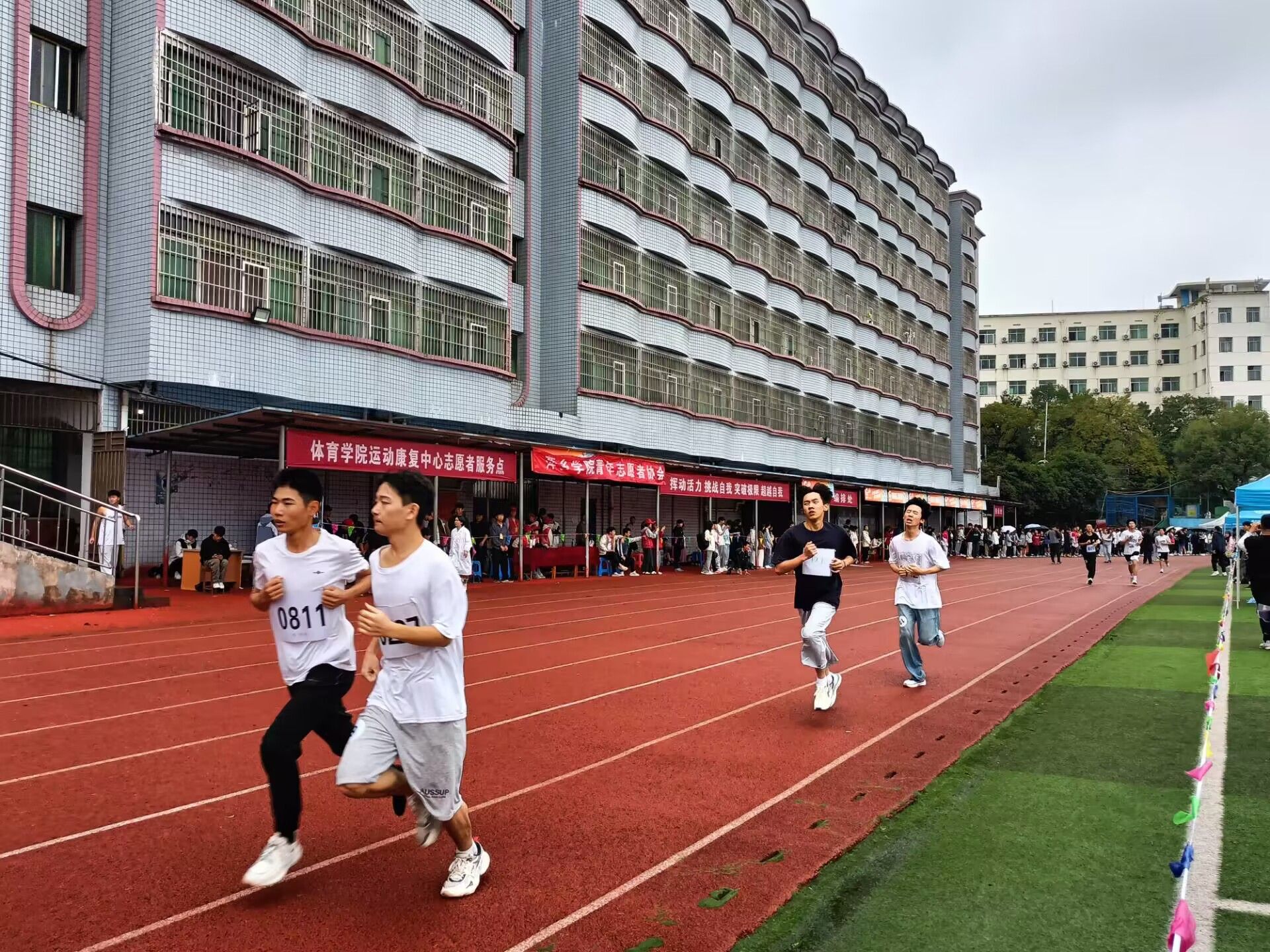 下午,令人激动的女子3000米比赛拉开序幕。你们相聚于3000米的赛道上,坚定的步伐跨过红色的跑道,迅捷的身影舞动周身的空气,汗水承载不屈的毅力。看,参加男子400米的外院健儿们,坚持奔跑的你们真的很优秀。接着是女子400米比赛,400米挡不住你们破竹的锐气。你们是勇士,你们不畏惧对手的强大,你们坚信你们的对手只有自己。挑战自我,战胜自我!青春的脚步,青春的速度,青春的活力,青春的激情,在你们的身上尽情展现!