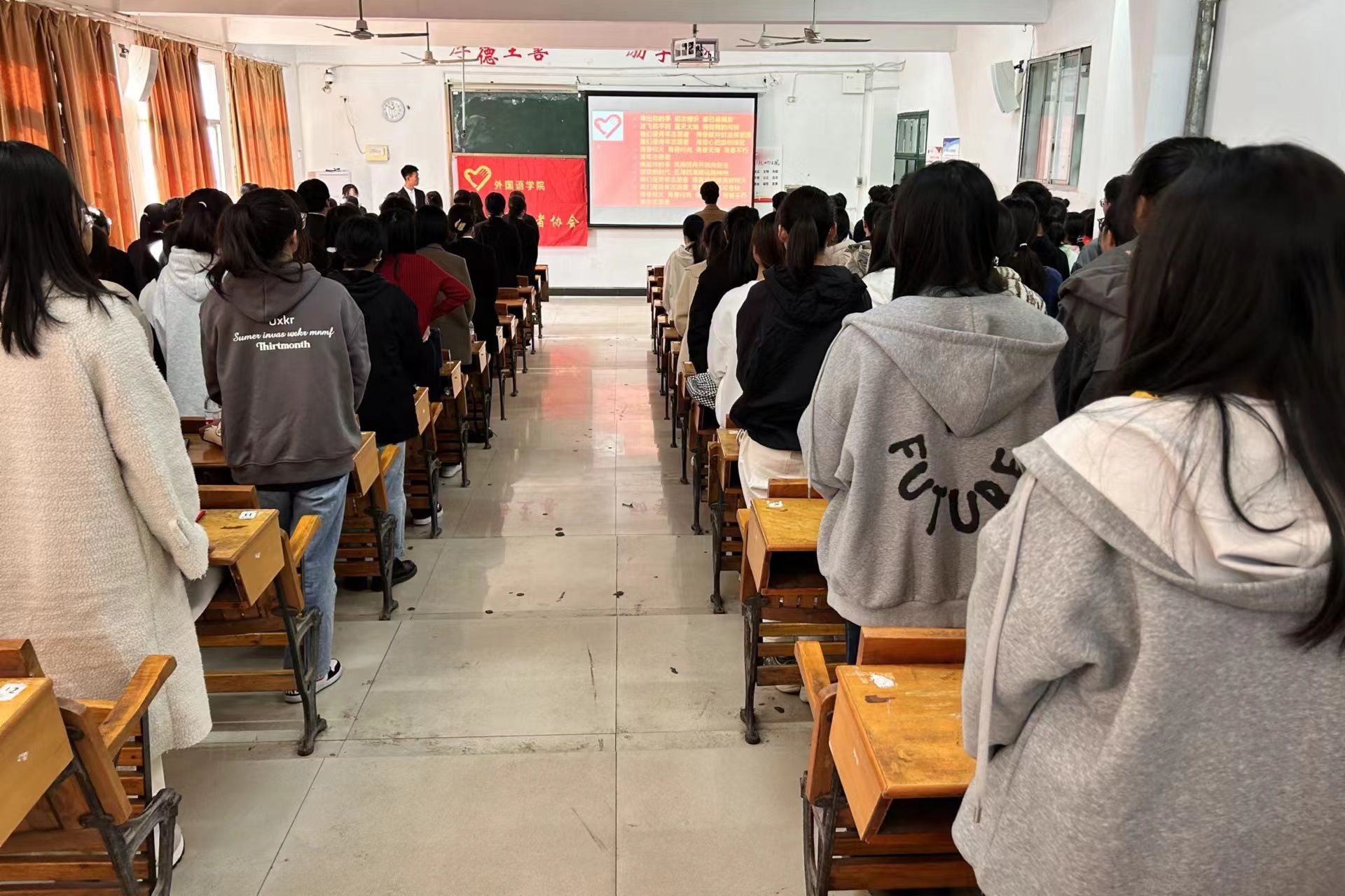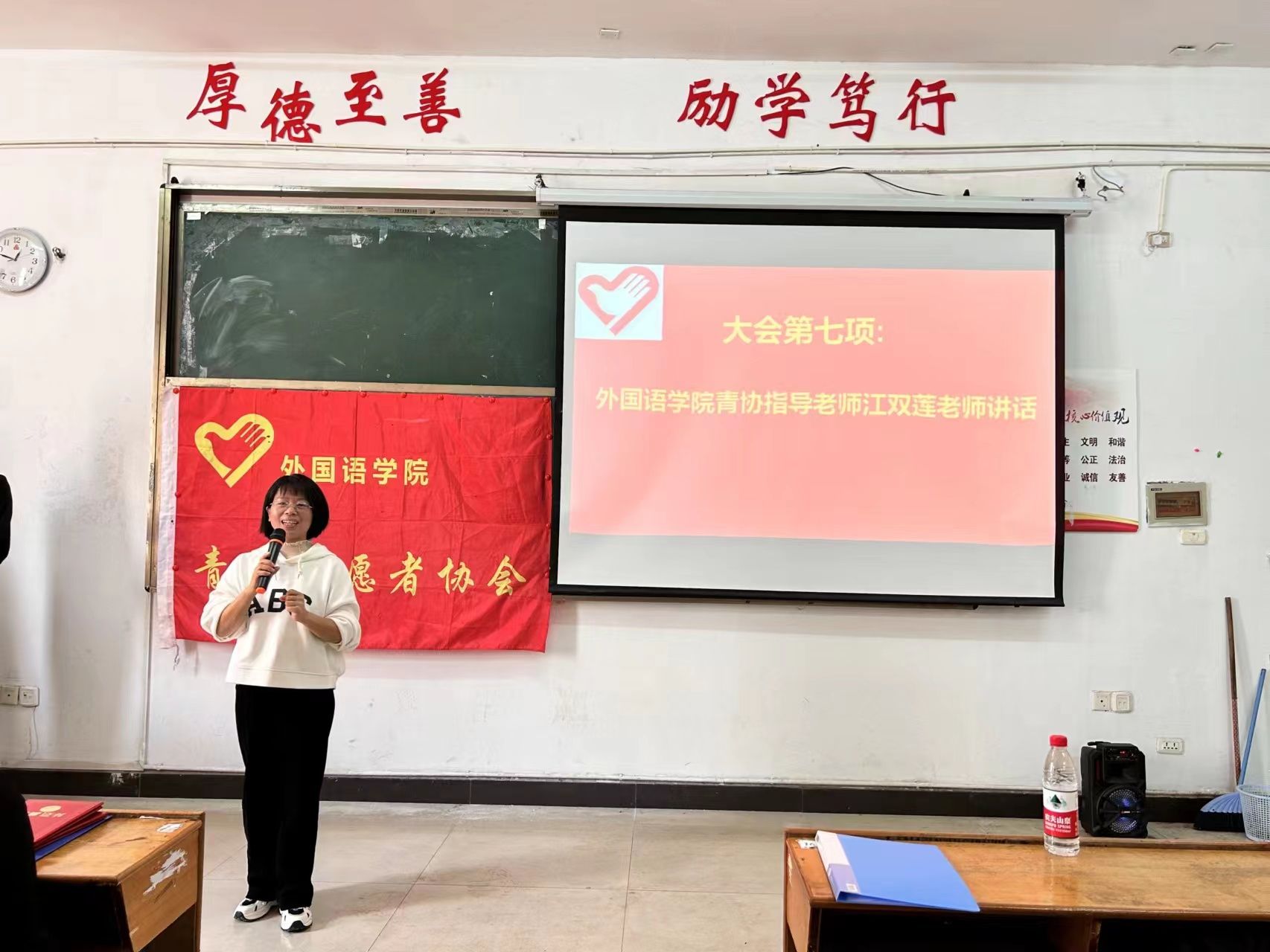 为了进一步增强协会的整体凝聚力,外国语学院青年志愿者协会于2023年11月21日,星期二,中午12:30在英华楼3306举办“第十届换届暨表彰大会”活动。参加本次大会的有外国语学院青协指导老师江双莲老师,外国语学院团委书记冷全宝老师,青协指导顾问王卫民老师,以及校五大组织代表、校四大媒体代表、各兄弟学院青协代表、外国语学院学生党支部副书记、外国语学院团总支副书记、外国语学院学生会主席、外国语学院宿管会主任、心理站站长、环保俱乐部会长以及外国语学院大一大二各班班长及团支书,外国语学院青协21级理事会成员,22级理事会成员以及23级全体青协成员。