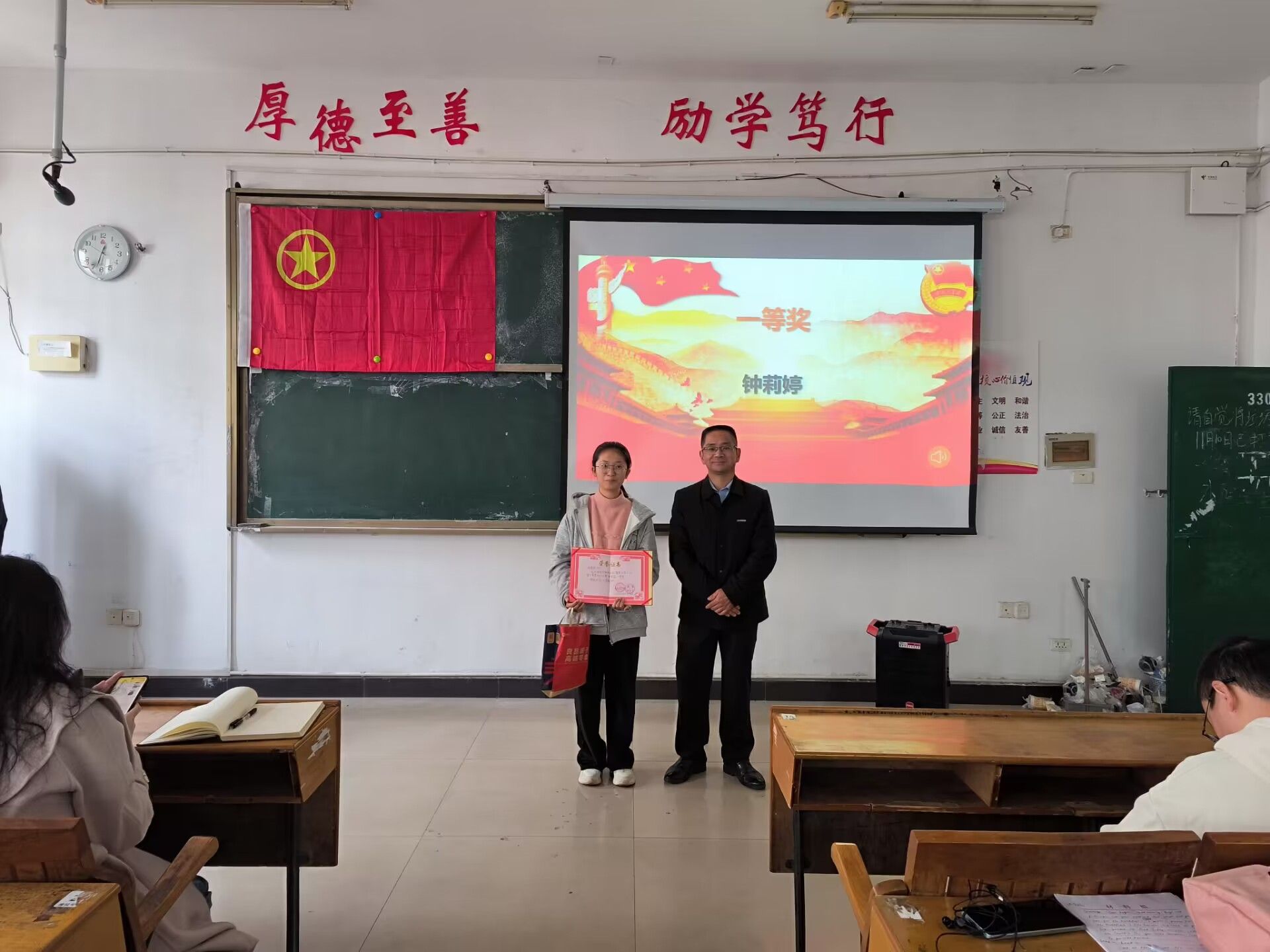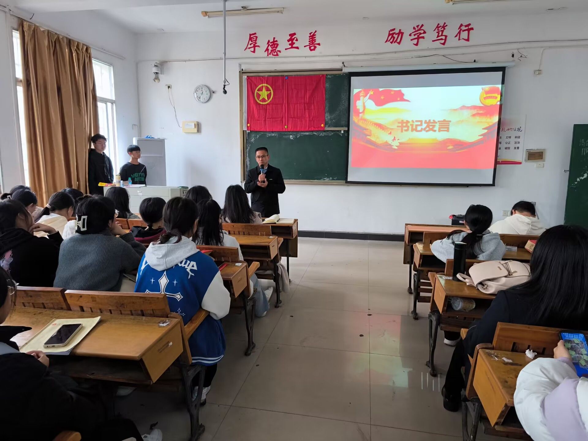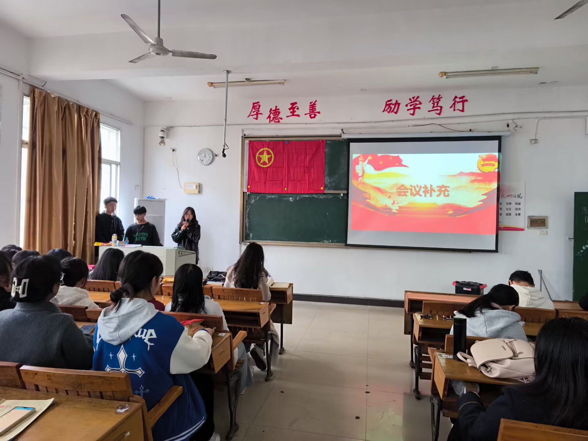 大会伊始,办公室主任进行考勤,确保全体学干准时到场。随后,进行文明教室的颁奖环节,冷全宝老师为获奖班级颁奖。其次,进行文明班级颁奖环节,冷全宝老师为获奖班级颁奖。接下来,进行优秀团支部颁奖的环节,刘佳萍书记为获奖班级颁奖。接着,进行寝室“红色文化,奋斗青春”征文比赛颁奖环节,办公室主任黄怡欣为获得优秀奖选手颁奖,学生会主席李闫潇为获得三等奖选手颁奖,冷全宝老师为获得二等奖选手颁奖,刘佳萍书记为获得一等奖选手颁奖。然后,学生会主席李闫潇对会议的内容进行补充,她指出学生会各部门已经完成换届,希望各部门部长增强领导意识,带领好各自部门的小伙伴。此外,各学干需要提高责任意识和自我管理意识,既要服从本部门的管理,更要重视校日检工作。最后,刘佳萍书记进行发言,寄言各学干好好学习不断提升个人以及班级的竞争力,希望各部门的新部长能带领本部门更上一层楼,提高学生会整体凝聚力。他还总结结了外院在运动会中取得的优异成绩,对此表示赞扬与鼓励。最后,本次学干大会拉下帷幕。