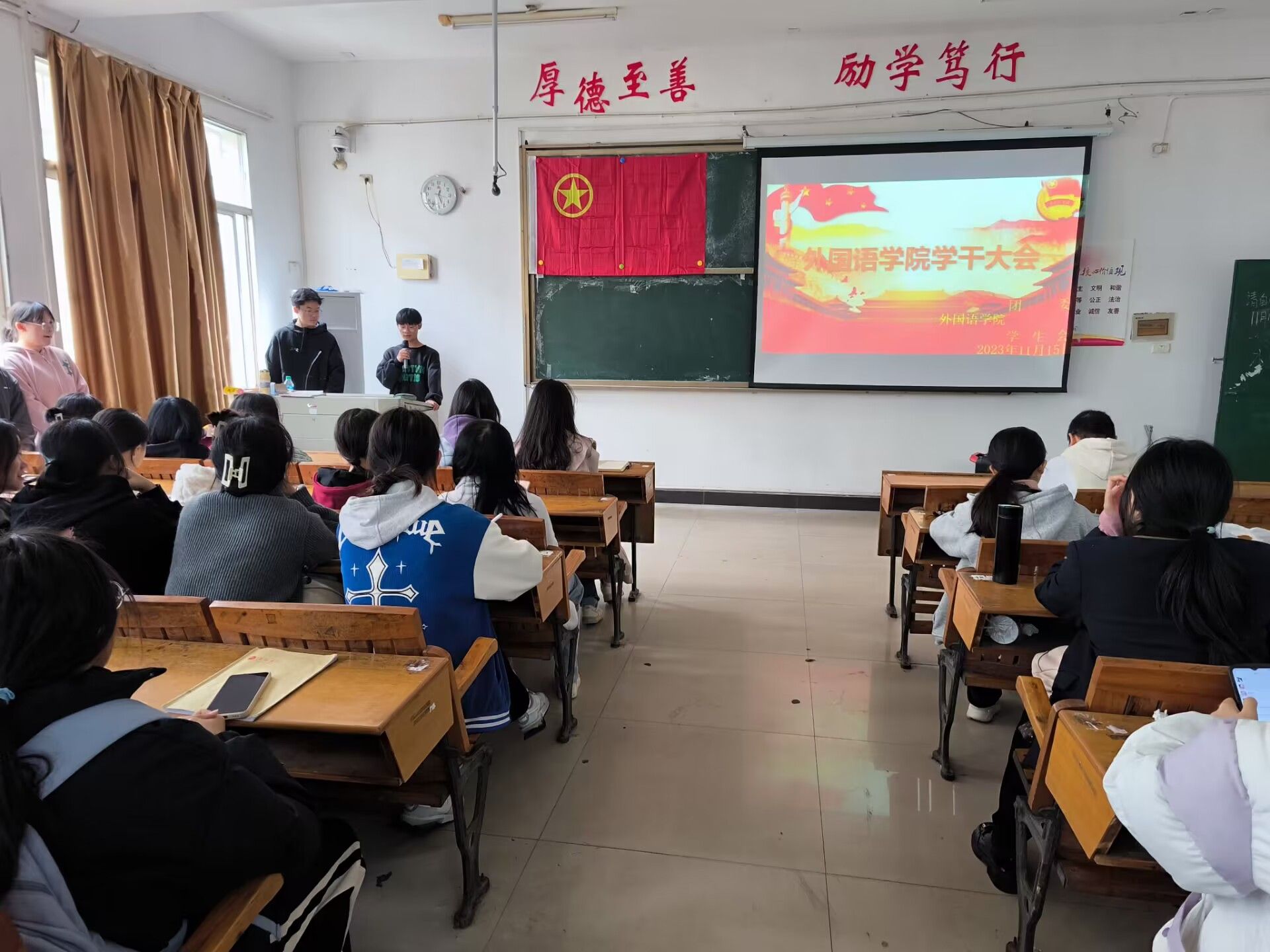 为提高各学干们的责任意识,促进各部门交流,方便外国语学院团委学生会工作的展开,外国语学院于2023年11月15日中午12:20于英华楼3306教室开展学干大会。莅临本次活动的嘉宾有外国语学院党委书记刘佳萍,团委书记冷全宝,学生会主席李闫潇,办公室主任黄怡欣,学生会副主席邓楠楠,团委书记助理余文彬,书记助理李娜,以及各部门部长和学干们。